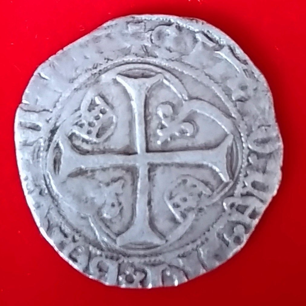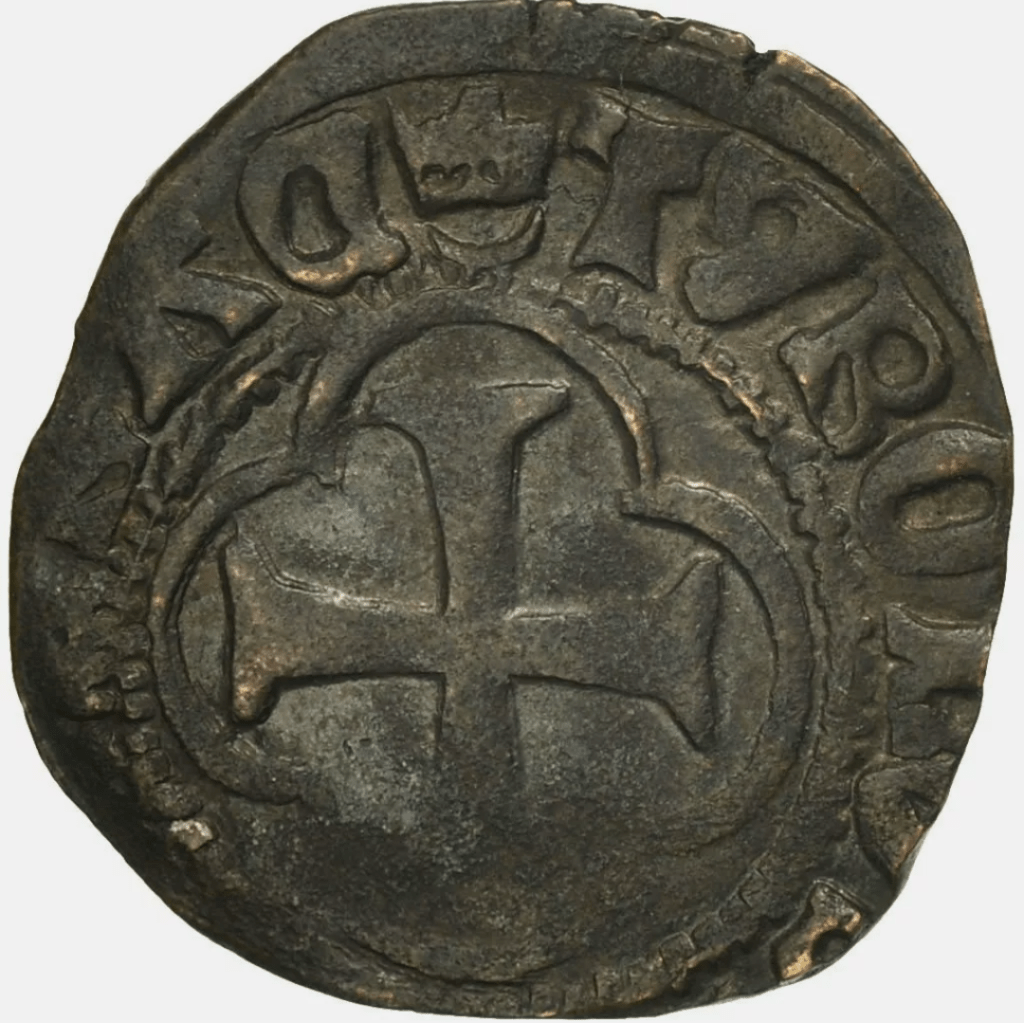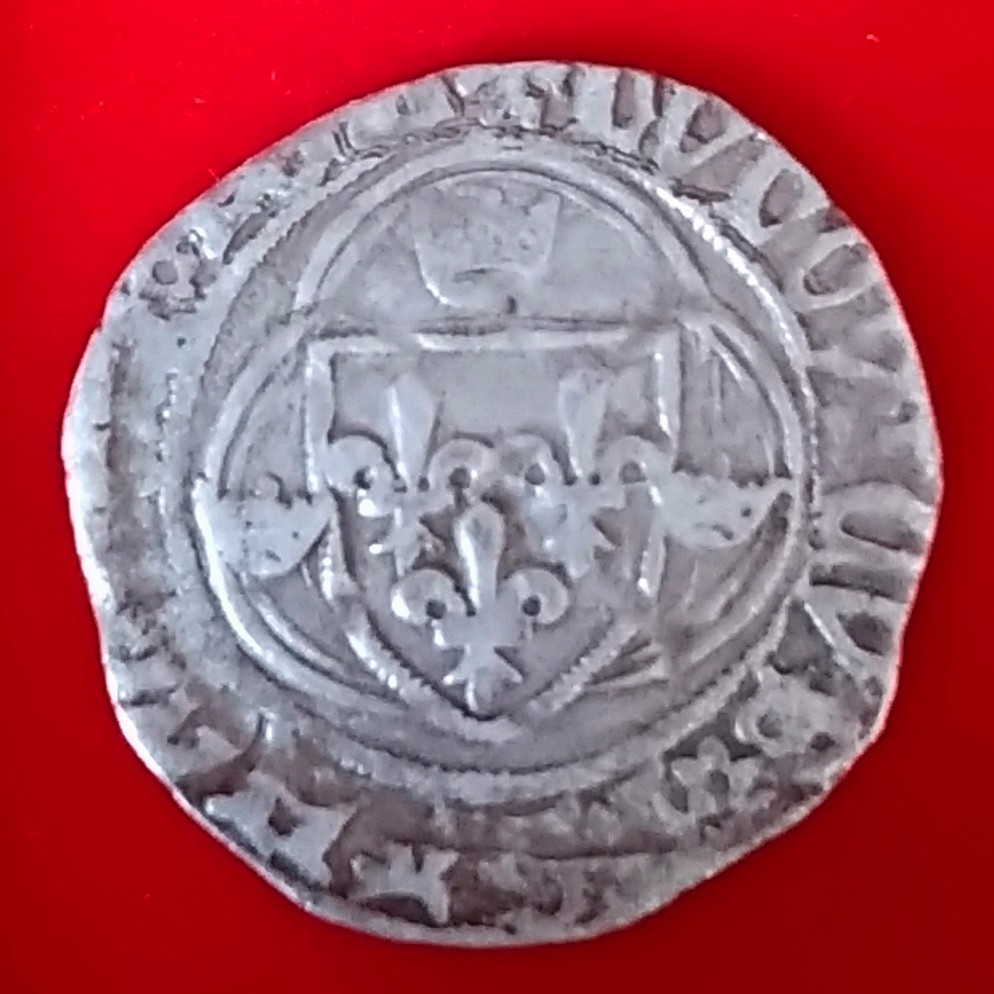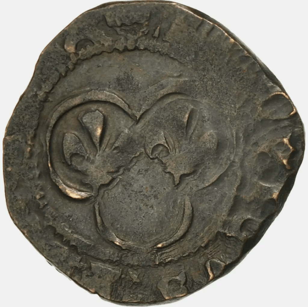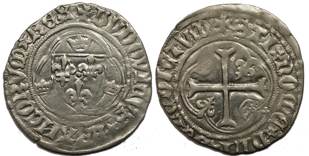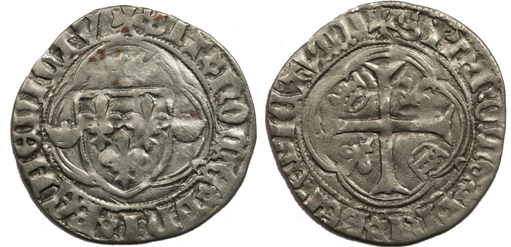 - Blanc à la couronne, variété à la légende de revers sur l’avers, 1461, Angers.