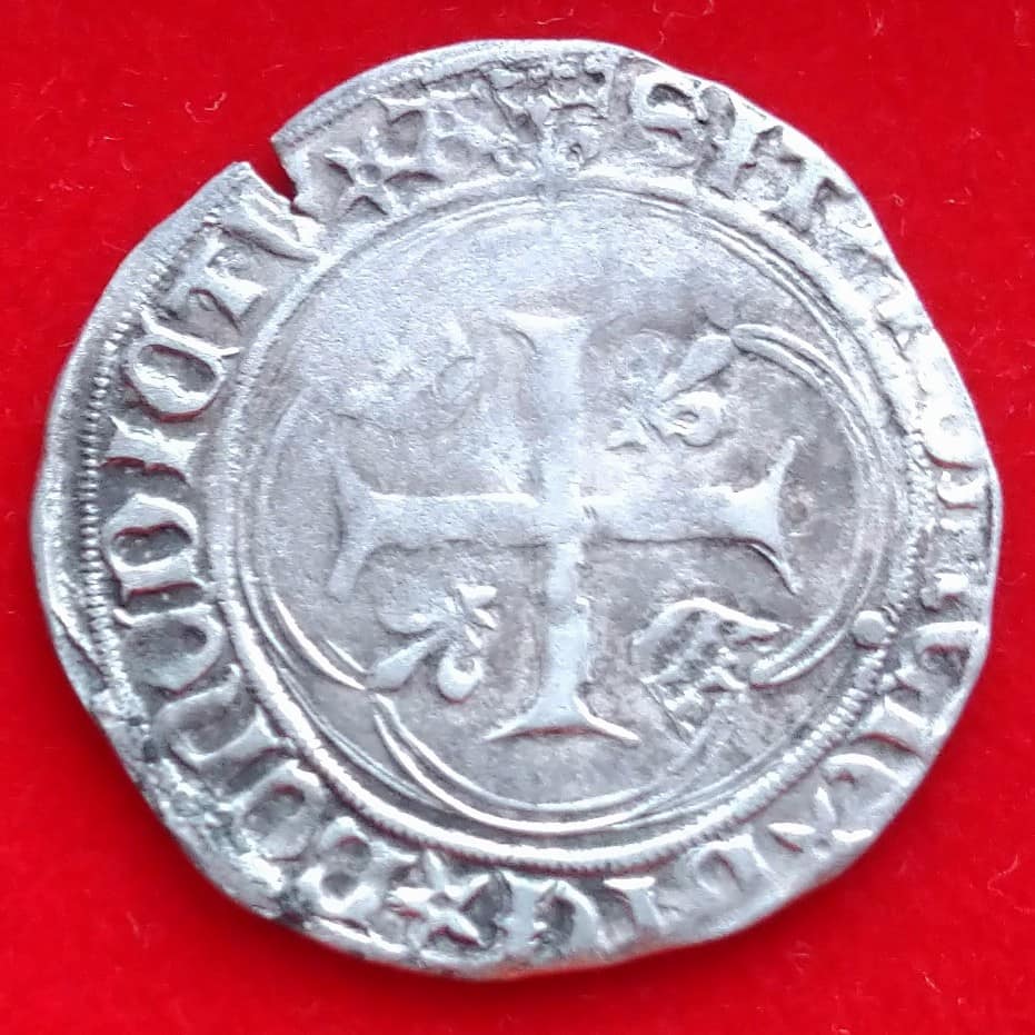 - Blanc à la couronne, 1498, différent A du maître Jehan de Landevy en fin de légende de l’avers, Angers.